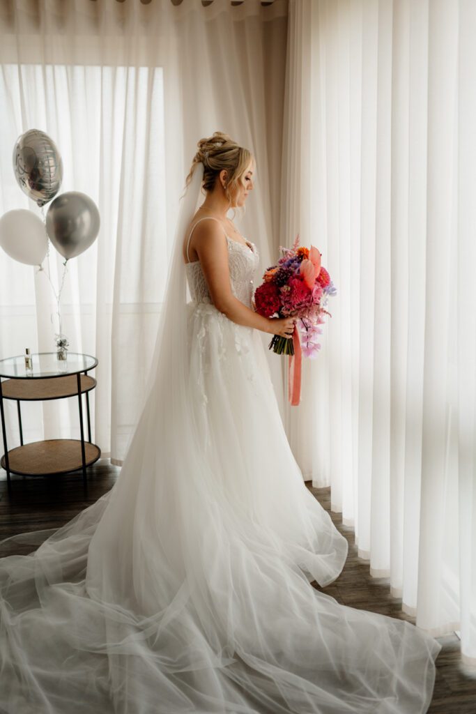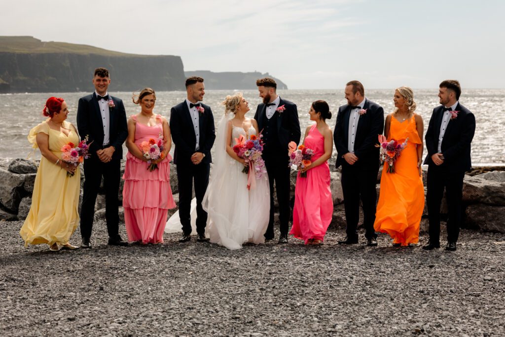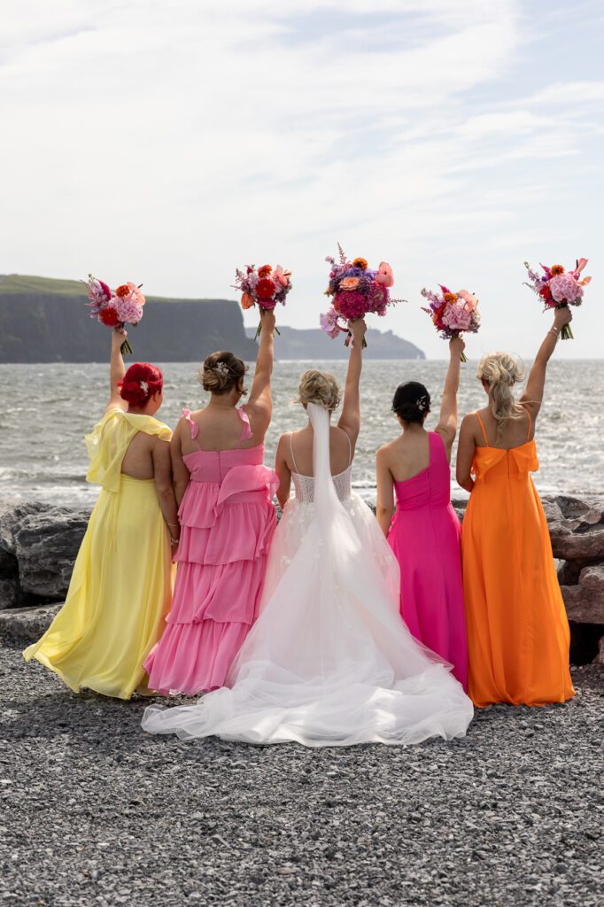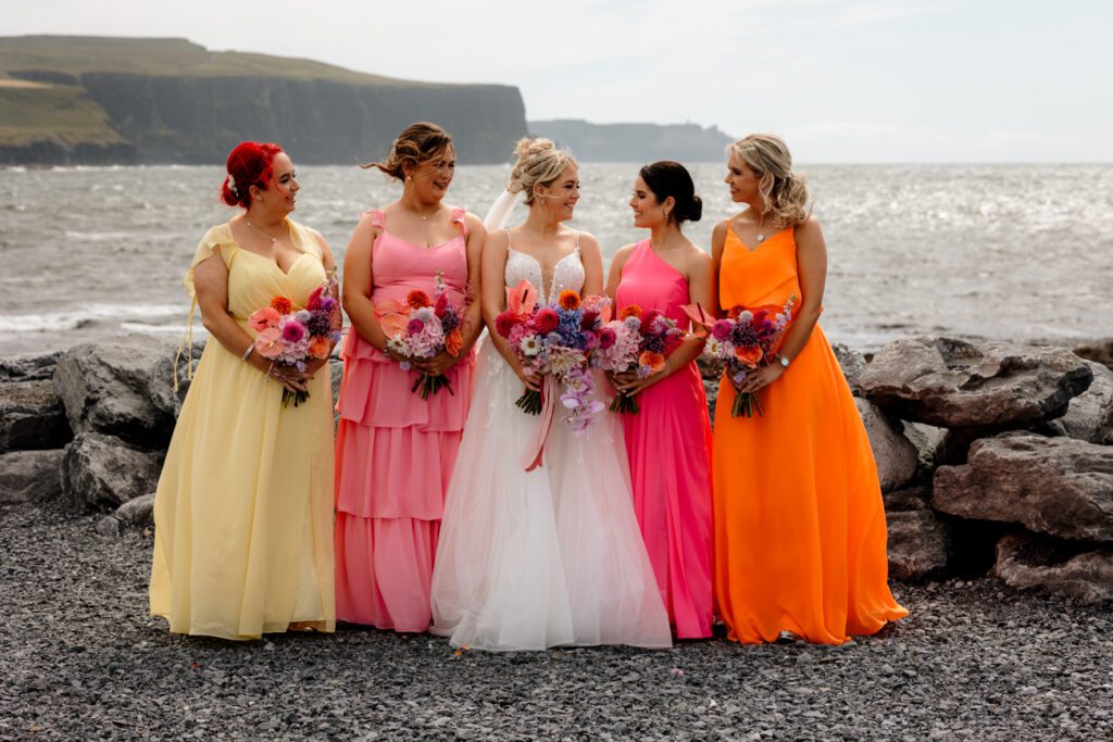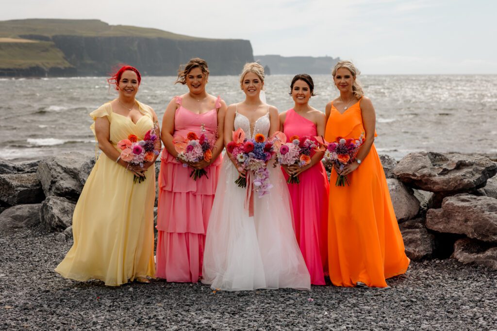 For my bridesmaids, I always wanted to do something different and loved the idea of mixed matched bridesmaids but had always seen different dresses in the same colour or same dress in different shades of a colour but my girls are all very different so that’s what made me decide that the dresses were all going to be totally different. When I started looking at colour palettes I kept getting drawn to the pinks and oranges and yellows so finally narrowed down shades I really loved and complimented each other and asked the girls to pick dresses in the colour they were going to be and I think they ended up looking very well together!