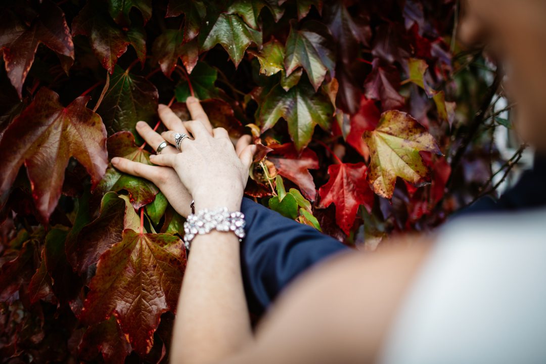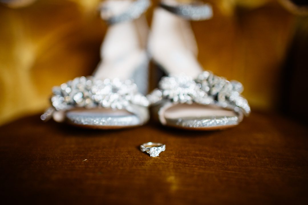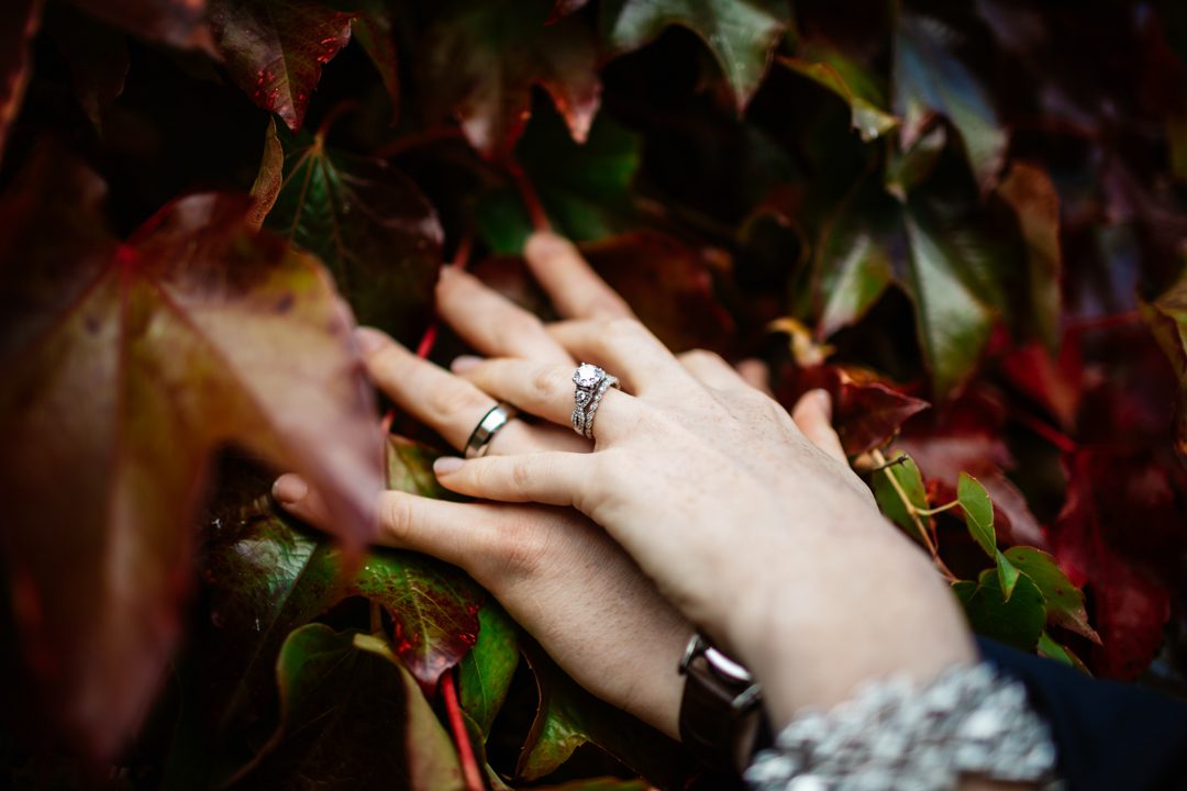 I like to get a good workout in and don’t like stopping to catch the scenery, no matter what! When we got further up the hill, our dogs suddenly ran ahead of us, which is atypical for them. Unbeknownst to me, our friends were at the top of the peak to stop me from continuing on the hike! As I said hello and turned to look over at Matt, he was down on one knee and speechless, having lost his carefully planned speech. In my shock and surprise, I put the ring on my hand and kissed him! We toasted with friends on the top of the peak and finished the hike with them.