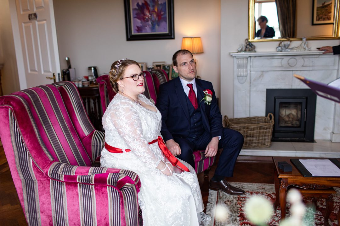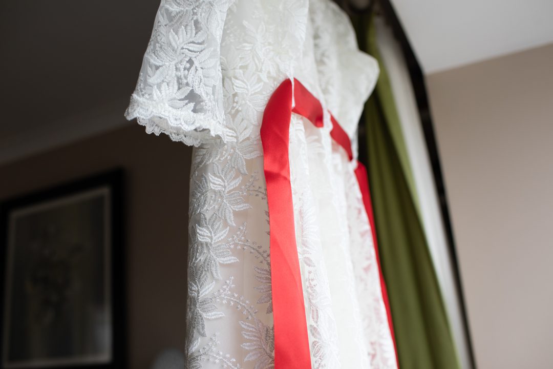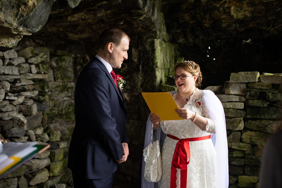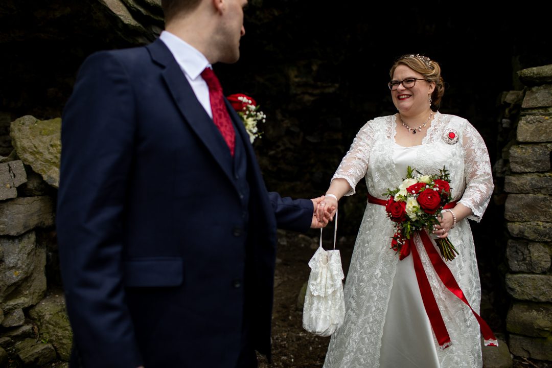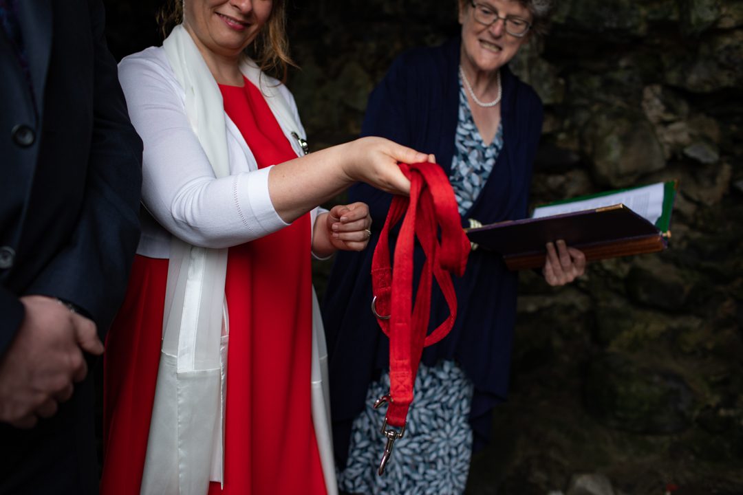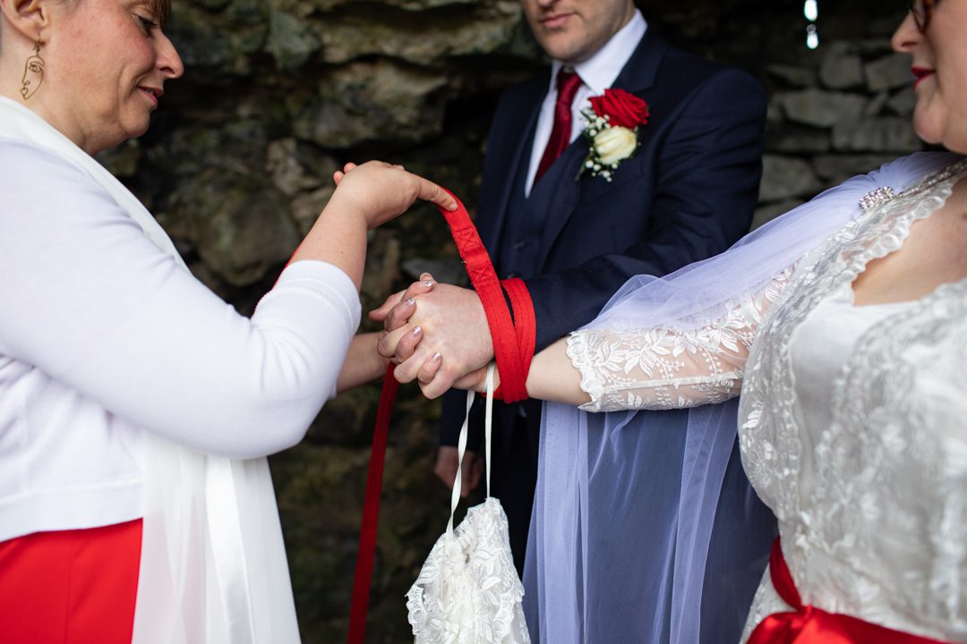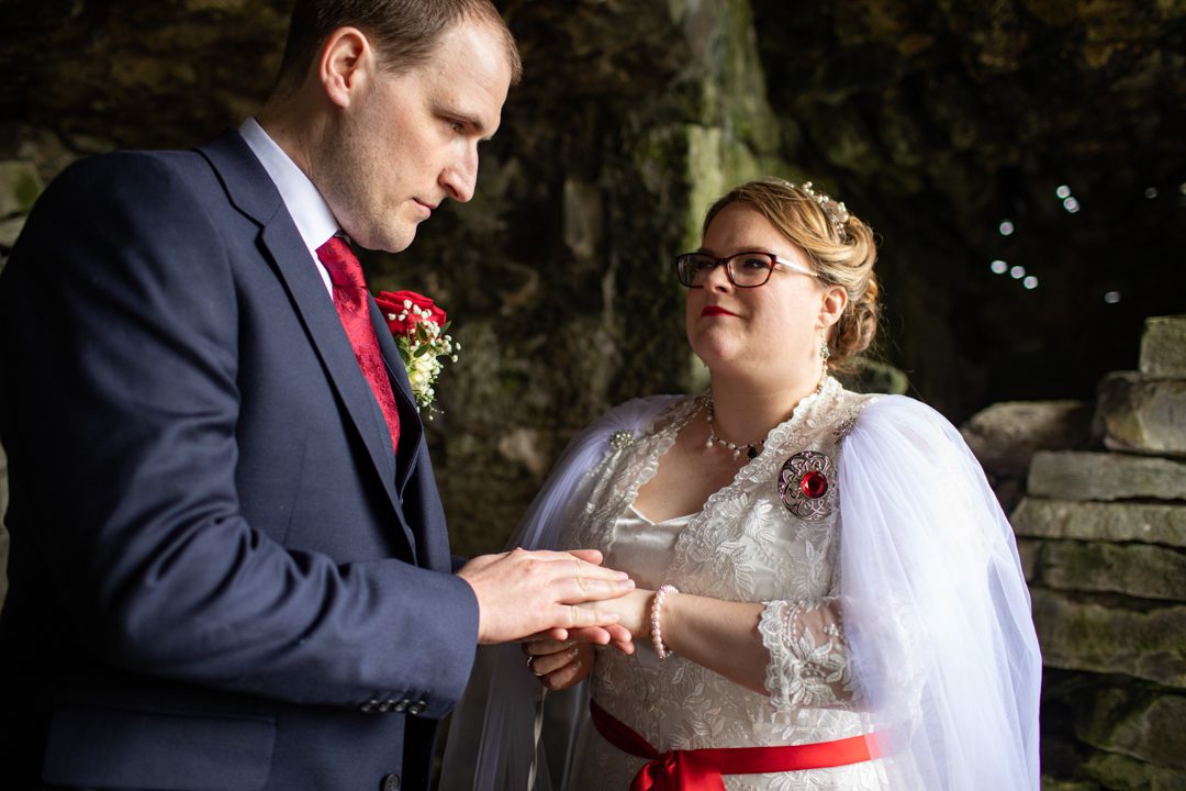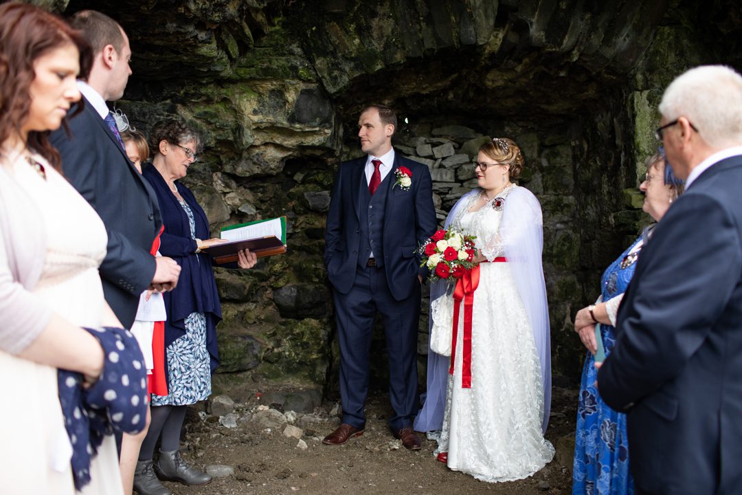 My father gave me a roman coin he’d found to incorporate into my wedding necklace as “my something old”. My mother gave me a silver sixpence with her birth year on it for my something borrowed. We have two dogs which are really important to both of us so we decided to be handfasted with their lead – which just so happened to fit in with my colours: red and ivory. The private and intimate feel of the wedding made for a simply perfect day for us.